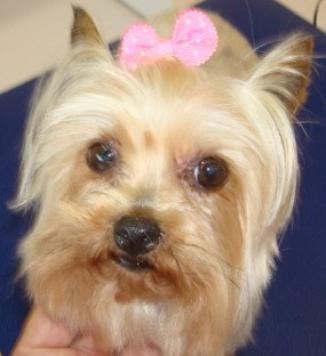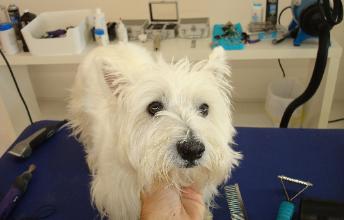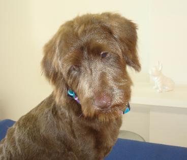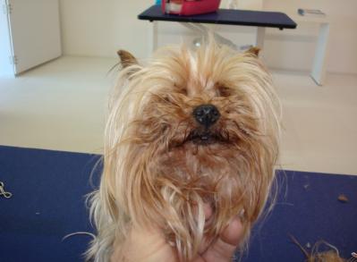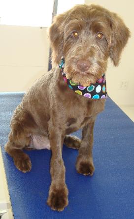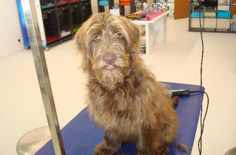 | This sweet little girl on the left was in the May tornado. She had to fend for herself in the rubble for two days before she was rescued! She is OK and in for a deserved day of grooming at Bark Avenue. I think she looks gorgeous now. |